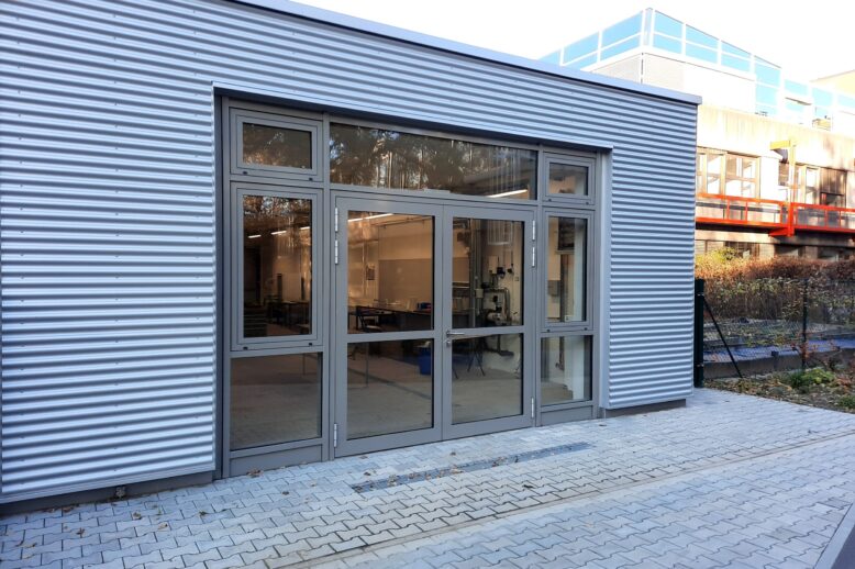 Fassadenbau mit Tür- und Fensterelementen im Gewächshaus der Fakultät NW1 der Universität Bayreuth